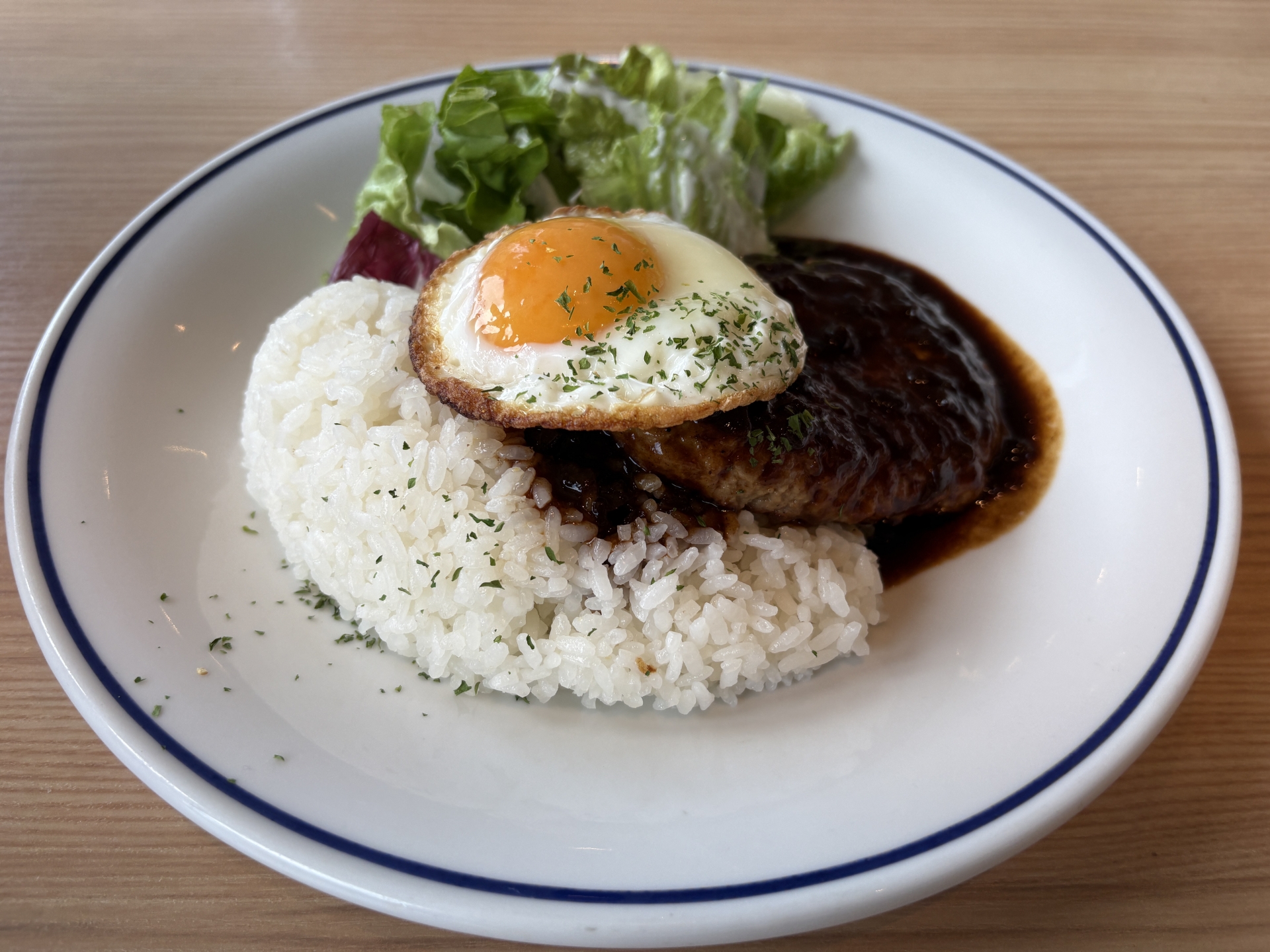 ある日、ランチタイムが終わり賄いでハンバークライスを作ってくれた。ランチとちょっと違うのは目玉焼きがブ厚くて「まんまる」だったんだ。この目玉焼がエラク美味しくて感動したので賄いを食べ終わってすぐに調理場からホールに