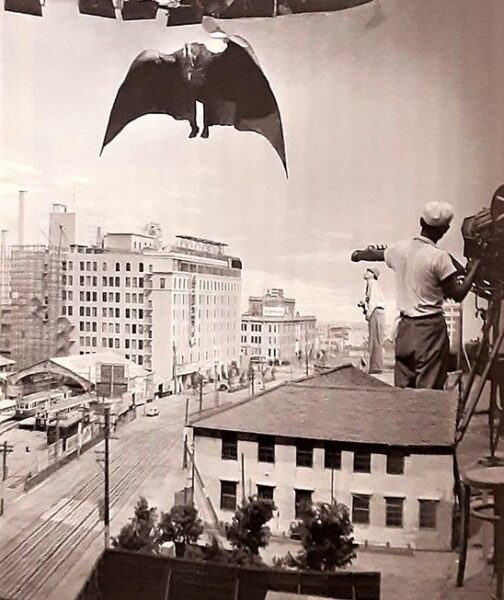 ラドンが上空を飛来したこの本編シーン実は、エキストラではなく
